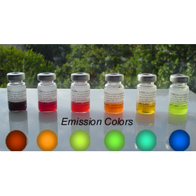 セレン化カドミウムナノ結晶は量子ドットとしても良くしられている単結晶半導体ナノ粒子です。これらの量子ドットの独自性は、粒子のサイズにより光学、電気特性が異なり、柔軟なプロセス可能性によってもたらされます。これらの量子ドットのサイズは2~7ナノメーターで、おおよそ可視域全般(青色~赤色)の光学特性を持っております。一般的なセレン化カドミウムの量子ドットは有機配位子が表面にコーティングされた無機半導体です。これらの配位子は、溶剤の中でのこれらのナノ結晶の安定性と溶解性、加工可能性を可能に致します。量子ドットは幅広い範囲の光を吸収して、限定された光を発光します。この特性は、幅広い範囲の光で励起することで、限定された波長の真の色の発光を得ることを可能にします。量子ドットの発光ポテンシャルは、溶剤の中のナノ結晶の品質とサイズ分布によって決まります。