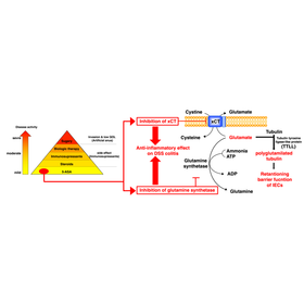 The limited number of drugs available for the treatment of inflammatory bowel disease(IBD) and their severe side effects, including immunosuppression, have led to calls for research into drugs without side effects. The inventors focused on the role of xCT, a cystine/glutamate antiporter, in IBD. Their research suggests that xCT inhibitors or glutamine synthetase inhibitors may be therapeutic/preventive agents for inflammatory diseases. [RESULTS] ・Mice with intestinal epithelium-specific xCT deficiency showed anti-inflammatory effects on dextran sulfate sodium(DSS) colitis(Fig.1). ・Glutamine synthetase inhibitor (MSO:Methionine sulfoximine) showed anti-inflammatory effects on DSS colitis(Fig.2).