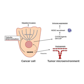 Vasohibin-2 (referred to as VASH2) knockdown significantly reduced metastasis of pancreatic cancer cells (Fig. 1) and prolonged survival period after orthotopic transplantation (Fig.2). The mechanisms of action are; (1)VASH2 knockdown reduces cancer cell invasion through suppressing of tubulin carboxypeptidase activity within the cell. (2) VASH2 secreted by cancer cells stimulates tumor angiogenesis, so when VASH2 was knocked down, tumor angiogenesis was prevented. (3) VASH2 regulates the production of inflammatory chemokines and cytokines in cancer cells, which in turn, accelerates the recruitment of MDSC and TAM and prevents the infiltration of cytotoxic T lymphocytes. The inhibition of VASH2 eliminates immune suppression in pancreatic cancer.