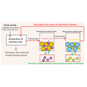 Solid wastes, including industrial wastes, rocks, and polluted soils, contain various elements such as hazardous heavy metals and rare earth metals. Conventionally, strong acids have been used as extractants to enhance the leaching of these metal ions, which are subsequently recovered using electrochemical methods. However, these methods have environmental and economic problems because they consume a large amount of chemicals and electricity. The inventors have successfully developed a process that uses a recyclable solution containing an environmentally friendly chelating agent as the extractant for metal ions and anions extraction from solid wastes, which are efficiently recovered from the extractant, enabling the regeneration and reuse of the extraction solution. The present invention is expected to be applied to the removal of toxic ions from polluted soil. It is also expected to be used for the collection of resources such as rare earths from minerals. Furthermore, it can be combined with CO2 mineralization technology using solid wastes. (E.G., Patent No. 7345791)