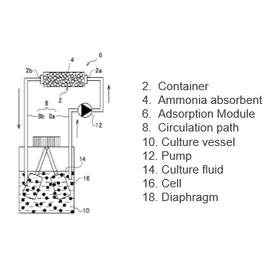 In recent years, there has been a demand for mass culture of cells in fields such as pharmaceutical manufacturing. Ammonia accumulating in the culture medium must be removed in order for cells to grow stably during culture. Ammonia is known as a typical waste product that adversely affects cells. Until now, waste products were removed from the culture using the principle of dialysis. However, in order to remove waste products sufficiently, the volume of the component preparation liquid tank was set to be more than 10 times the volume of the cell culture tank, so there was a problem that the required volume of liquid was enormous and costly. The present invention made it possible to provide a new ammonia removal technology. Embodiments of the present invention are an ammonia adsorbent and an ammonia removal method. The ammonia adsorbent of the present invention comprises at least one substance among L-type zeolite, ferrierite, ZSM-5 type zeolite, a strong acid cation exchange resin and a Prussian blue type complex. Thus, cells can be cultured more efficiently.