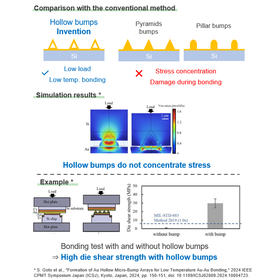 Bonding between components is a critical step in semiconductor packaging, especially as devices become more complex and sensitive. Traditional bump structures like pyramids or cones rely on stress concentration to achieve strong joints. However, this often results in damage to the device or substrate. Our novel hollow bump technology addresses this issue by allowing the bump to deform plastically under low loads. This exposes fresh metal surfaces, low-temperature bonding with minimal stress. This approach reduces the risk of mechanical damage while maintaining strong interconnect performance, offering a promising solution for semiconductor assembly.
