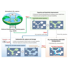 In recent years, CO₂ geological storage using mafic and ultramafic rocks—such as basalt and peridotite, which are rich in calcium and other metal elements that react with CO₂ to form carbonate minerals—has garnered global attention as a means of reducing atmospheric CO₂, a major contributor to global warming. However, subsurface environments for CO₂ storage are typically low in temperature and therefore have limited reactivity. Additionally, the amount and connectivity of pores as well as permeability of the subsurface rocks are not always sufficient, presenting significant challenges that require innovative technological solutions. In storage methods that involve dissolving CO₂ in water, the use of seawater is preferable. However, during the storage process, it is also necessary to temporarily suppress the reaction between metal ions in seawater and CO₂ until the CO₂ is securely stored. This invention promotes CO₂ geological storage and mineralization by using biobased, biodegradable chelating agents that enhance mineral dissolution and capture metal ions. By dissolving minerals in subsurface rocks using the chelating agents, the amount and connectivity of pores (CO2 storage capacity) increase, and the permeability (CO₂ injectivity) is also improved. Furthermore, when CO₂-charged seawater containing the chelating agents is injected into subsurface rocks, it becomes possible to simultaneously store both CO₂ and the metal ions required for carbonate mineral formation with creating additional rock porosity.