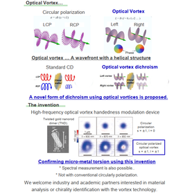 Chiral materials absorb right- and left-circularly polarized light differently (circular dichroism). Optical vortices, however, carry orbital angular momentum; their topological charge l can take unlimited integer values (±1, ±2, ±3, …). Using this richer degree of freedom enables material characterization, chirality discrimination, and a new measurement modality (“optical-vortex dichroism”) beyond conventional circular dichroism. Conventional vortex generators are limited to low-frequency modulation, leading to high noise and poor S/N. The invention engineers the optical system to achieve left–right vortex modulation at high frequency, reducing noise. We demonstrate detection of the “geometric twist” in twisted gold nanorod dimers (TND: paired, twisted nanoscale rods), suggesting defect detection in fine metallic wiring and applications in semiconductor, MEMS, and metamaterial inspection, as well as discovering new properties and enabling chirality identification.