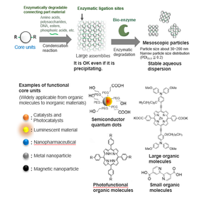 Mesoscopic particles, ranging from several tens to several hundred nm in size, have attracted attention in a wide range of fields as interesting materials where quantum size effects and bulk effects interact or synergize. Regarding manufacturing methods, top-down approaches such as physical grinding and bottom-up approaches such as chemical synthesis have been proposed. However, these methods face challenges related to yield, dispersibility, and cost, necessitating new solutions. In this study, the inventor has developed a novel manufacturing method to address these issues: the "Biocatalytic Nanoparticle Shaping method" (BNS method), which utilizes enzymes. The BNS method can be applied to fabricate various mesoscopic particles by combining enzyme-degradable materials with organic/inorganic materials. For example, semiconducting quantum dots (QDs), porphyrin molecules, bipyridine molecules, and nanographene were used as core units, resulting in nearly monodispersed mesoscopic particles with uniform sizes, obtained as stable aqueous dispersions.