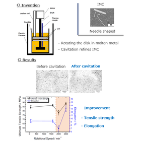 Improving the recycling rate of aluminum (Al) is becoming more important. Recycled Al contains impurities such as iron, silicon, and zirconia, which form intermetallic compounds(IMC) and reduce its mechanical strength. Convectional methods use ultrasonic vibrations to refine these compounds, but scaling up the process remains a challenge. To solve it, the inventor has invented a machine that applies cavitation treatment to molten recycled Al. This simple machine design makes it easier to scale up and use in industrial applications compared to conventional methods. Experimental results showed that the machine effectively refined IMC and improved the strength of recycled Al. This invention could significantly advance aluminum recycling.