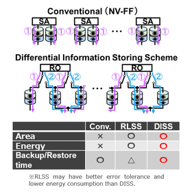 Intermittent computing executes tasks as energy accumulates, enabling continuous edge computing under unstable, low-power energy harvesting conditions. Ensuring processing continuity before and after frequent power interruptions is essential. A nonvolatile logic circuit using nonvolatile registers allows internal state retention with only local data transfers, making it a promising option. Conventional nonvolatile registers connect 1-bit memory circuits (nonvolatile flip-flops, NV-FFs) per bit, requiring two MTJ devices per bit, leading to significant area and energy overhead. This invention proposes the Reference-Load Sharing Scheme (RLSS), where 1-bit information is retained between an MTJ device and a reference MTJ device using a sequential backup-restore process. This reduces MTJ device count, shares circuit functions, and achieves 49% lower energy consumption and 34% area reduction, as confirmed by simulations.
