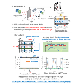 ・ Electronic holography for displaying three-dimensional (3D) information is required for entertainment, industrial design, measurement, and head-up display for automobiles. ・3D information is displayed by reconstructing an image through a spatial light modulator(SLM). SLM cannot narrow the pixel pitchbecause the electric field leaks out to adjacent pixels, resulting in a narrow viewing-zone angles. ・Therefore, the invention introduces a liquid crystal driving system in a lateral electric field by a continuous potential difference and fine ground electrodes into the SLM. ・As a result, the electric field leakage is reduced, the pixel pitch of less than 1 μm is achieved for the first time. ・Using the pixel pitch of 1μm, it is possible to achieve practical viewing-zone angels of 30°. invention is expected to enlarge electronic holography application field.
