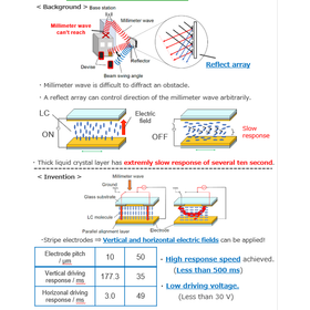 ・ At millimeter wave communication, there is a concern about increasing coverage hole which is area where the communication becomes impossible. ・ Therefore, installing the reflect array for all over city that can control the direction of electromagnetic wave is proposed. ・ A conventional reflect array composed of liquid crystal (LC) has problem of slow response. ・ In the invention, reduction of response time is achieved by forming a stripe electrode on substrate which can be applied vertical and horizonal electric field. ・ The invention is not only expected to apply for reflect arrays, but also phase modulators and phased array antennas.
