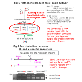 Garden asparagus is a dioecious species, with male [XY] and female [XX] individuals. Since male individuals are preferred over females for agricultural production, all-male cultivars have agronomic advantages over mixed-sex cultivars. To produce an all-male cultivar, it is important to obtain a supermale [YY]. Given their morphological similarities, males and supermales are usually distinguished by genetic analysis. Although two sex-linked codominant markers (Asp2-SP6 and RM17) have been reported previously, their ability to distinguish the sex in A. officinalis and other dioecious Asparagus species was limited. We developed a new CAPS marker (SSM01). SSM01 is applicable for discrimination between X- and Y-specific sequences in various A. officinalis and purple asparagus cultivars, also in three dioecious Asparagus species.