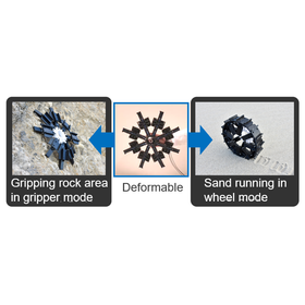 Robots that search for planets and collect damage information on disaster-stricken areas need to be able to cope with both rough terrain, such as steep slopes and uneven surfaces, and flat terrain. However, it is difficult to improve the mobility efficiency of both rough and flat terrain. For example, a robot that can climb by grasping steep slopes has poor mobility efficiency on flat terrain, and a robot that can move by wheels on flat terrain is not suitable for moving steep slopes and uneven surfaces. The present invention relates to an end effector that acts as a gripper when traveling on rough terrain and a wheel when traveling on flat terrain. By applying the end effector to a robot, a robot with high moving efficiency can be realized on both rough and flat terrain.