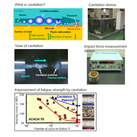 Cavitation is a phenomenon where a liquid becomes an air bubble due to the decrease of saturated steam pressure of the liquid caused by pressure decrease occurred by the velocity increase of a liquid. In particular, group-row cavitation consisting of microbubbles produces a large impact force. Cavitation shotless peening which uses this phenomenon, has a smoother machined surface and higher fatigue strength than the method which uses steel balls (shot peening). Operation in air is also possible without using a water tank, by injecting a high speed water jet into a low speed water jet.