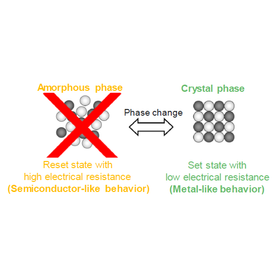 In recent years, the data traffic on internet around the world has been increasing rapidly and there is a strong need to innovate the non-volatile memory for data storage. In particular, phase-change memory (PRAM) has been attracting attention since the practical use in storage class memory has already begun. In general, PRAM records ON/OFF at 2 states: crystal phase with low electrical resistance and amorphous phase with high electrical resistance. However, the operation requires the use of amorphous phase so the heat resistance is poor and generates high power consumption during melting to the amorphous phase. Actually, there is a high expectation for creating a non-volatile memory element which solve these issues. The most important feature of this invention is that the non-volatile memory material is in crystal phase for both ON/OFF status. Since this material does not require melting to the amorphous phase, it is thermally stable and has low power consumption. Therefore, a significant operating energy reduction can be realized. Moreover, it has excellent high-speed property because a large resistance variation can be obtained through phase change between the crystal phases. Tohoku University proposes 3 types of non-volatile memory material : 1 MnTe, 2 Nitride-based material, 3 Rare-earth material.