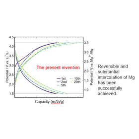 Rechargeable magnesium batteries (RMBs) have been developed as post lithium-ion batteries. Previously, only the Chevrel compounds were known to be available as a cathode material for RMBs. However, practical RMBs require cathode materials, which could deliver high capacity with higher electrochemical potential. The present invention provides cathode materials with a disordered rocksalt structure for RMBs. The novel chemical composition of the present material successfully enables reversible and substantial Mg intercalation, which has been previously believed to be difficult, especially in the rocksalt structure. The materials of this patent will expectedly yield cathode materials with higher capacity and electrode potential.