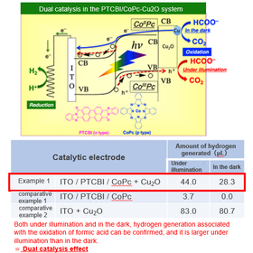 Photocatalysts are materials that induce redox reactions under illumination. In particular, it is effective for downhill reactions (oxidative degradation of hazardous and pollutants) and titanium oxide (TiO2) which is UV light responsive, is already in practical use. However, TiO2 photocatalytic technology is limited to small amounts and low concentrations of substances based on the solar light spectrum, and there is a problem that oxidation degradation treatment similar to that under illumination is never induced in the dark conditions. In his research for application as a photoelectrode and photocatalyst for organic p-n junctions, the inventor found that organic p-n junctions can catalyze (= dual catalysis) the oxidation of thiols even in the dark conditions [1]. In addition, as a result of his intensive research, he succeeded in expanding the target of dual catalysis to formic acid, hydrogen peroxide, and hydrazine by supporting a cocatalyst on organic p-n junctions. Dual catalysis is a new type of catalysis that TiO2 does not have. The selection of organic p-n junctions and co-catalysts is expected to expand the application range and market size of catalysts for environmental purification applications.