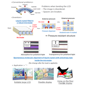 ・In a conventional liquid crystal display(LCD), when a large pressure is applied from the outside or a steep bending deformation is forced, the display image is disorderd cause of thickness variation of the liquid crystal layers, and the substrate spacer is damaged. ・Therefore, liquid crystals are difficult to apply to flexible displays because of such problems. ・The invention packs a liquid crystal material into robust microtubes and arranges them in a plurality to form a liquid crystal layer. ・Using such a structure, pressure force can be dispersed even when pressure is applied from the outside. ・It is expected to be applied to a robust and flexibile liquid crystal display.