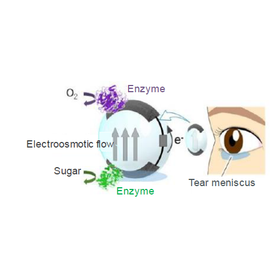 With the spread of contact lenses (CLs), the number of patients suffering from dry eye is increasing. In addition, the spread of smart CLs with biomonitoring, communication and display functions is expected in the future, and effective measures against dry eye are required. The present inventors have developed a CL-type device capable of preventing dry eye based on their long accumulated "hydrogel synthesis and molding technology" and "biocompatible battery power generation technology". Specifically, they developed a hydrogel material with high electroosmotic flow generation efficiency and excellent moldability. They found that when applied to CLs, water flow is generated in the lens by energization, which can maintain the wet state of the CL and stabilize the tear film on the cornea. Furthermore, they have succeeded in mounting a bio-battery on a contact lens to drive it as a self-standing device that does not require external power supply (right figure). The present invention is important not only for the prevention of dry eye, but also for the controlled release of eyedrops and the control of intraocular pressure by inducing aqueous humor drainage. It is expected to develop as a method for injecting and injecting eyedrops into and out of eye holes, which is similar to eye drops and syringes.