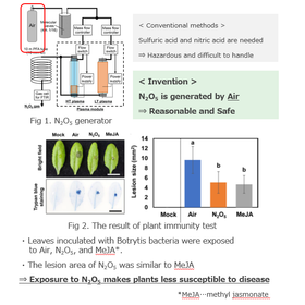 ・ Conventional N2O5 generator is difficult to handle because of the need for hazardous raw materials and complicated equipment, which makes industrial N2O5 utilization difficult. ・ Since the invention succeeded in using Air as the raw material gas, it became possible to generate N2O5 reasonable and safety. ・ It is expected to solve the problems of conventional light and heat sterilization methods and virus inactivation methods, so on. Enhancement of plant immunity ⇒ Expression of disease resistance genes in plants Application of fertilizer components ⇒ Promotion of plant growth by supplying nitrogen components Sterilization and virus removal ⇒ Sterilization and virus removal by N2O5