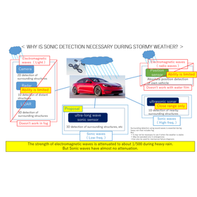 As represented by the microphone, the industrial application of the equipment using the sound wave for the information acquisition of the surrounding environment is carried out. In recent years, various sensing technologies have been studied for the purpose of realizing the autonomous driving in the transportation field (automobile, etc.). Among them, the technology that utilizes sound wave measurement as a sensing device is attracting attention. Traditionally, lasers and cameras have been considered as detection means, but the loss of detection sensitivity during stormy weather such as rain is a major obstacle to the realization of autonomous driving, and technological innovation has been desired. The present invention enables the realization of a detection device that is resistant to disturbances in the surrounding environment. In reviewing the process of converting sound waves into electrical signals, the inventors devised a new signal conversion method and successfully demonstrated a new device.