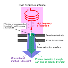 In an apparatus for generating a plasma by a high frequency discharge and extracting an ion beam, a high frequency electric field leaks to a beam extraction interface being distant from the plasma generator; the oscillation of the interface leads to a divergence of the beam. The beam divergence has been a serious problem in thermonuclear fusion plasma reactors, since a part of high intensity beam cannot reach the core of the magnetically confined plasma. The present invention is an ion beam generator that uses a certain technique to compensate the oscillation of the beam extraction interface and provide a collimated high intensity ion beam extracted from an rf plasma source. Conversely, it is also possible to expand the divergence angle by superimposing the oscillation of the beam extraction interface to form a large diameter ion beam for material processing.