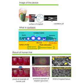Toothbrush, pulsatile water jet, ultrasonic scaler, dental raser and oral rinse are used to wash bio-film or cavity accumulated on teeth or surface of implant. However, while they can remove macroscopic bio-film, they can not completely remove bio-film accumulated in narrow space on rough surface of tooth or dental implant. In the result, number of dental extraction from peri-implantitis or periodontal disease is not small. This invention provides the oral cleaning device which can remove bio-film by using cavitation jet.